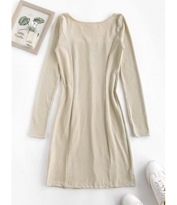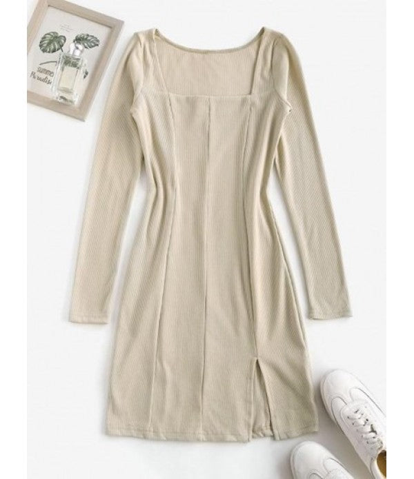 Cut from the flexible stretch-rib fabric, this dress is characterized by its square collarline, long sleeves, and a structured form-fitting silhouette with a split hem. As for styling? We reckon your best bet is to pair this piece with accessory and stilettos. Style: Brief